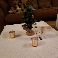 Played around with my centerpieces today and I’m super happy with how they came out! The W will be replaced with a 4x4 wood block with our table numbers in dark green and the table cloth won’t be...