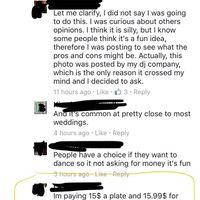 I was going through one of the FB wedding groups I'm in and saw a post asking what people thought about dollar dances and I knew there would be some terrible responses but ugh. Attached is one...