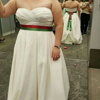 I haven't shared pictures of my dress, but here it is at my first of three fittings. Our colors are begonia pink and clover green, so those are the ribbon colors on my dress. I decided at some point...