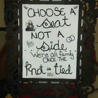 When I first saw this sign on another site I just had to have it at my ceremony. So I went and got a decent sized white canvas, a border, some flat spray paint and a fabric marker and this is the...