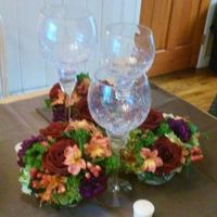 Our reception will have ivory floor length table cloths with a chocolate brown overlay, plates and napkins will both be ivory. Our mockup centerpiece will have ivory candles. Our menus will have burnt...