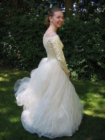 Tried you mother's wedding dress on? Just found this pic from a couple years ago when I was helping my mom move. We found her dress in the process, so I decided to try it on. She was tiny! Couldn't even zip it up all the way. Definitely not the style...