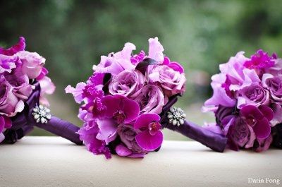I have beautiful dark purple dresses for my bridesmaids, originally I had chosen a brown dress and orange calla lily's. Now I'm questioning the burnt orange calla lilys with the purple dress. My dress is ivory so I'm not sure about the white calla...