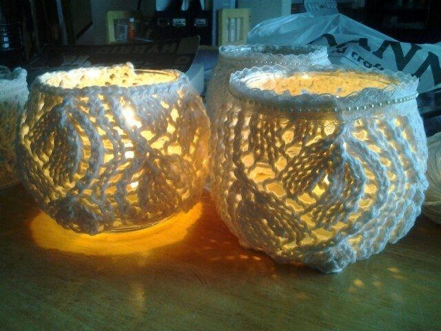 I have been knitting these lace cozies for my reception tables and figured on putting tea light or floating candles in them instead of flowers, and have about 3 or 4 at each table, to have the whole barn lit up. They seemed kind of plain to me so I...