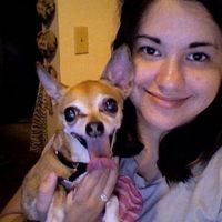 It is storming pretty heavily here and my chihuahua, Mocha, is freaking out. She shakes a lot and sticks her tongue out. It is so cute because she looks happy.
