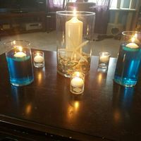 Beach wedding centerpieces. We are thinking round tables with 8 people. What do you think? (More photos in comments)