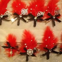So here is my latest DIY. Are they presentable? All the bouts have Skelton keys, red feathers and bling! The bout with the silver rhinestone flower is for FH and the little key is for the ring...