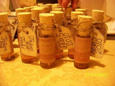 im having a steampunk wedding so for favors im getting some small bottles and filling them with liquor...different types...for the kids and non alcohol drinkers ill put candy in them. and put a label on them like old vintage marked poison. there will...