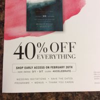 If anyone is planning to use Wedding Paper Divas, they have a 40% off sale next week 3/1-3/7. Discount code in pic