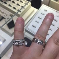 FH and I went to look at wedding bands today totally planning to just browse. Instead, we came home with wedding bands!! First pic is FHs and mine (please excuse my awful nails). Better pic of mine in comments!