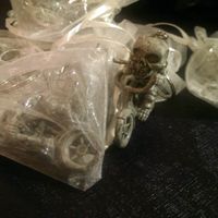 Ok.. my FH is obsessed with skeletons so I purchased skeleton key chains and originally put them in organza bags but then it looked to girly.. so, I found these favor boxes and glued on the will you...
