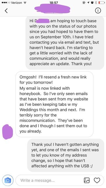 Hoping to get some guidance here. We had our wedding on June 3rd & haven't received our photos yet. In our contract, the projected timeline for delivery was 8-10 weeks. Well, with our wedding being earlier in the wedding season, our photographer had...