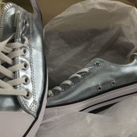 I found my wedding shoes!!! I've always wore Converse so I knew that's what I wanted to wear. I found these beautiful light blue metallic shoes!! I think I'll add silk laces? To top it all off they...