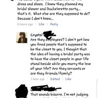 This is why I didn't want a bridal party, but my mother begged me to make my sister maid of honor, because she gave birth to us lol. Well my sister is not going because...wait for it...she found out...