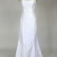 I can't believe this happened! I just found my dress in a little consignment shop, in the "twice wed" section, which means this will be its third wedding. My baby has history! It is literally NOTHING...