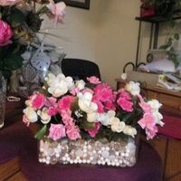 I slept late and needed something to do today, my mind is in wedding mode, naturally. This is what I came up with. The flowers are for the table and there will be very short long narrow arrangements...