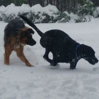Our puppy (the German Shepherd) experienced deeper snow for the first today! If anyone else has pictures of their pups in the snow, I'd love to see them.