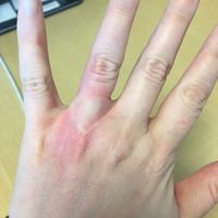I got engaged in the middle of January and have been wearing my ring ever since. Today my skin got real itchy under my ring. So I switched it to my other hand. A few hours later the side of my pinky...