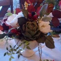 I finished my first centerpiece rough draft and wanted to share! The flowers are crepe paper flowers that I made! I plan on also adding more fresh greenery the day of. Any thoughts or suggestions?