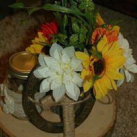 First mock centerpiece. Ill add some sunflowers and the table number in the horseshoe.