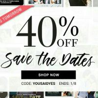 Today only use coupon code "YOUSAIDYES" for 40% off Save The Dates on Wedding Paper Divas website. Happy shopping!
