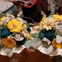 My mom came down for a few days and we have been busting out bouquets all day! Got mine, and 2 bridesmaids done! Just need to add a small bow to the handles. I handpainted all the sola wood flowers...