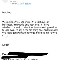 I emailed a local vendors to inquire about hiring a bartender or possibly using them as a bartending caterer (they do both). This was the reply I recieved today. I never would have thought a vendor...