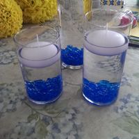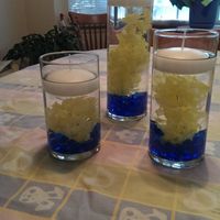 I've been experimenting and I like both of these centerpieces that I've tried out. Our colors are cobalt blue and yellow. I love the roses, they look so real. I think I might try the lighter blue...