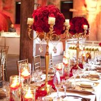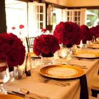 Decorator Quote based on 80 guest Fresh Red Rose Centerpieces ( Vase Rental Included) Eggplant Purple Satin Tablecloths Red Satin Dinner Napkins Gold Chargers Gold Chavari Chairs Sweetheart Table and...