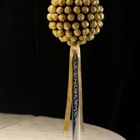 I've seen quite a few of ferrero rocher trees but this one stands out to me . It looks more elegant and I thought this would look cool as centerpieces . It kinda reminds me of the New York NYE Ball...