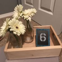 So FH's dad made these cool crate things for centerpieces. Do you guys think they would look better stained? Also, for the milk bottles, any suggestions for what to put in the bottoms, if anything?...