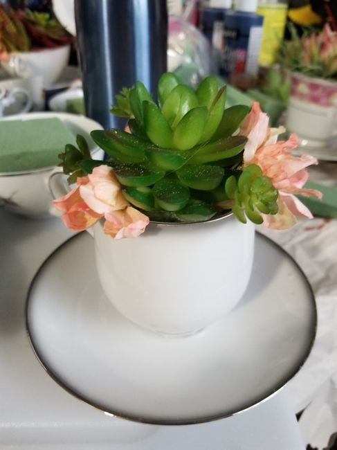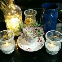 I put these together as a trial run for the centerpieces. Under them will be vintage doilies my grndmother and great grandmother made. Colors are Navy, Coral, and Rose gold. I will have some coral...