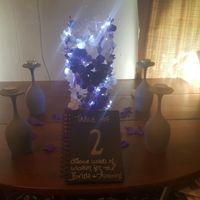 Keep in mind, there will be water and tea lights in the big glass with the string lights that are on it now, votive candles on the wine glasses, a stand for the book to be held up and the table linen...