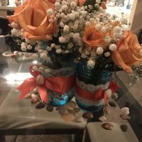 I'm ordering bulk flowers online and DIYing centerpieces. Teal mason jars, coral ribbon with a bow, a seashell at the center of the bow, and seashells scattered around the centerpiece. The roses will...
