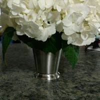 My tables at the venue are small. Most fit 4-5 with 2 tables seating 6. So my arrangements must be small. Bought mint julep cups from a restaurant supply store. A dozen for $50. Planning to do...