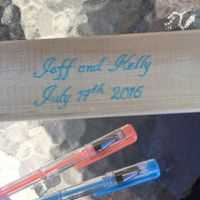 Our guestbook is made of Jenga blocks. I finished our "us" piece and am so happy! The two pens are our colors that guests will use to sign their own pieces. (My daughter insists I give credit to her...