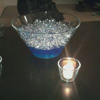Here is a picture of the start of my centerpieces. I got the bowls from Ikea and have clear and blue water marbles. We bought some floralytes to go in each of them to make them glow. We are not...