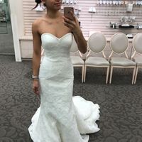 Went to pick up my dress and I was so nervous that it wouldn't fit!! It fits!! Only 8 more months of staying the same size. I don't need any alterations. Just a bustle (just found out it's free!). I...