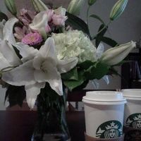 I thought his Starbucks run was taking a suspiciously long time....... Flowers and TWO lattes - one for now and one for later. He even asked for hydrangeas b/c I loved them in our wedding flowers....