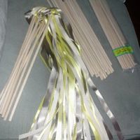 Here is the ribbon wand stuff I have! *8 fully made ribbon wands with yellow, taupe and ivory ribbons *22 dowels with eyelet screws already attached *19 plain dowel rods (don't ask me what happened to...