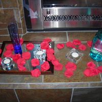 I'm having a long buffet table type reception.These were my ideas for decor/centerpieces first the mirrors will be aged to look weathered, 2-3 times more petals (will not be red that's all I had on...