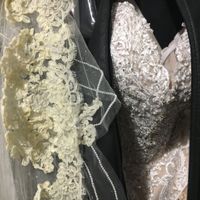 I excavated my mom’s wedding veil from her basement today. Wowzers it’s yellowed! I found a champagne cathedral length veil with ivory lace I like for $300 at the shop I bought my dress....