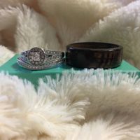 I'm so excited!! My FH picked out a ring made from an old whiskey barrel as his wedding band and pictures just don't do it justice - it is absolutely gorgeous in person! I also got my wedding band...