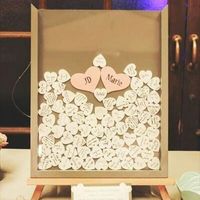 So our alternative guest book is a shadow box frame and guest sign hearts and drop them in the open top. We also have just a regular guest book that im going to glue small envelopes to the pages and...