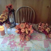So what do yall think about these for centerpieces? I was originally going to do all lanterns but I ran across these cornucopia baskets so I just filled them with a bunch of leaves and pumpkins that I...