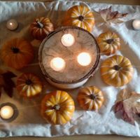 Hey it's been a while since I've posted, been working on my centerpieces...can I get any advice I'm thinking of changing the pumpkins from the fake to little real ones. Oh and more leaves