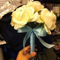I got a great "real touch" white rose bouquet from hobby libby half off. Decided to put together pins and jewels to give it more bling, also took off white bow and ribbon and redid it with baby blue...