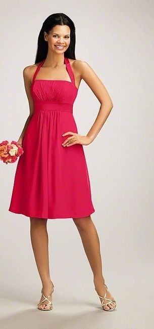 So Saturday, I went with my BM's to Alfred Angelo to look at BM dresses. We chose a chiffon halter, which everyone LOVED (at least they said they did haha) in Fuchsia. Last night I was Googling pictures of the dress in "real" wedding photos...and I...
