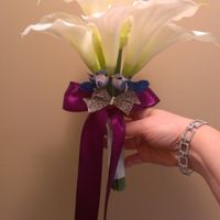So I went to Hobby lobby and bought a Real Feel "His & Hers" brand calla bouquet on sale 50% off ($10 vs $20). I took all the silk leaves out. I bought purple satin ribbon for an accent...