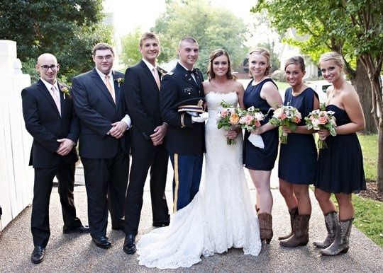 I'm getting married in Austin, Tx and my colors are plum and charcoal gray. I would love for my bridesmaids to wear cowboy boots because my theme is rustic vintage. However, FH doesn't want his groomsmen to wear boots. Would it look weird if the...